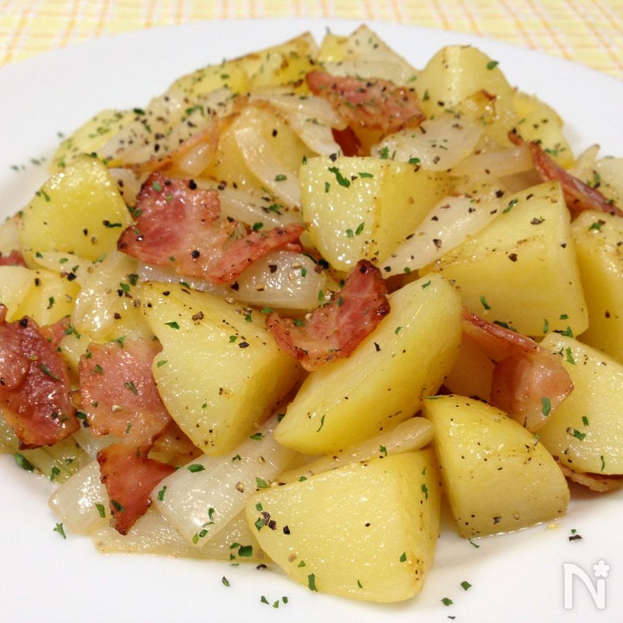 1. ベーコンポテトポタージュ、材料ジャガイモ、玉ねぎ、ベーコン、水、コンソメ顆粒、塩、粗挽き黒胡椒 、作り方、ジャガイモと玉ねぎを柔らかくなるまで煮て、ベーコンを加えてさらに煮込みます。最後にコンソメ顆粒と調味料で味を整えます。 2. チーズハッシュドオニオン:材料:玉ねぎ、ジャガイモ、ピザ用チーズ、片栗粉、鶏がらスープの素、塩こしょう :作り方: 千切りにしたジャガイモと玉ねぎにチーズを混ぜて焼きます。片栗粉でとろみをつけて、鶏がらスープの素で味付けします。 3. 甘辛ガーリックのジャーマンポテト:材料: ジャガイモ、ウインナー、玉ねぎ、バター、にんにくチューブ、醤油、酒、みりん、砂糖、ブラックペッパー 、作り方: ジャガイモをレンジで加熱し、ウインナーと玉ねぎを炒めます。調味料を加えて甘辛く仕上げます。 4. ポテトミートグラタン:材料: 合挽き肉、ジャガイモ、玉ねぎ、ピザ用チーズ、牛乳、バター、塩、ケチャップ、ウスターソース、にんにく、薄力粉 :作り方:ジャガイモをレンジで加熱し、ひき肉と玉ねぎを炒めてミートソースを作ります。耐熱容器に重ねてチーズを散らし、トースターで焼きます。 どれも簡単に作れるので、ぜひ試してみてくださいね。
